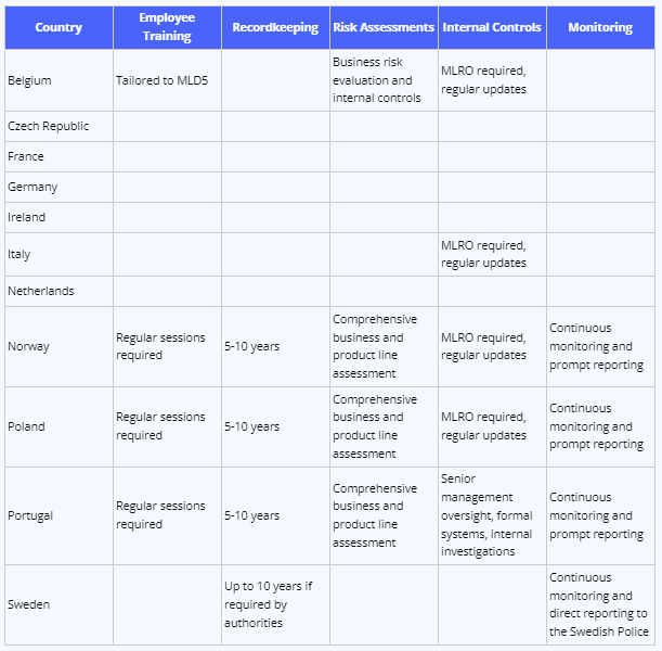 Companies with multinational AML obligations should keep in mind the differences when implementing and adapting compliance strategies across Europe to ensure they meet both EU and local regulations. These above table provides a birds eye view of the key differences for AML requirements from country to country within the EU.